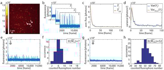with . This is a superposition of three exponential functions and has in total eight parameters. Using the constraint and applying the pseudo log-likelihood approach from [33] to numerically determine , and (see Materials and Methods), we can derive the number of fluorophores from Equation (8) for (first frame):