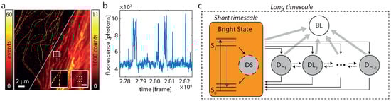 Each fluorophore can be described by a diagram of states as depicted in Figure 2c. Fluorescence is only emitted in the transitions from to . All other states are “dark states” and a fluorophore which enters the bleached state will never leave it. It is important to note that the transition rates of the fluorophore span vastly different timescales, which range from ∼ s to min or less. The exposure time of the detector, which typically lies in the range of a few 10 ms, sets a natural time grid to the experiment. Changes which occur on shorter timescales cannot be directly observed, while changes on longer timescales can. Therefore, we describe the dynamics of such a fluorophore as a time-discretized two-timescale Markov model. A short-timescale model treats fast dynamics on timescales and subsumes all involved states , and DS (Figure 2c). A long-timescale model treats slow dynamics on timescales . It consists of states: the bright state which reflects the net effect of running the short-timescale model for a time , and r “dark states”, namely the bleached state BL and states DL. Note that states with similar lifetimes can be combined into a single state (see Remark 1 in [33]).