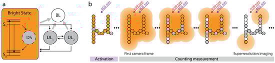 Alexa 647 can be switched off and on by red and UV light respectively, and is most likely in its bright state without illumination. Since it is beneficial for our analysis to know the initial state occupation , we first applied 405 nm on-switching light (Figure 3b). Thus, it can be safely assumed that all Alexa 647 molecules are in the bright state at the beginning of the measurement ( in Equation (6)), which is marked by the activation of the red excitation laser and the simultaneous start of the data recording. As time progresses, Alexa 647 molecules may occupy any of the indicated states and accumulate in the long-living dark and the bleached state. When enough fluorophores have entered these states such that the molecules that are in their bright state are on average much more distant from each other than the diffraction limit, their images can be discerned and thus localized. In this case, the recorded data can not only be used for counting but also for sub-diffraction imaging.