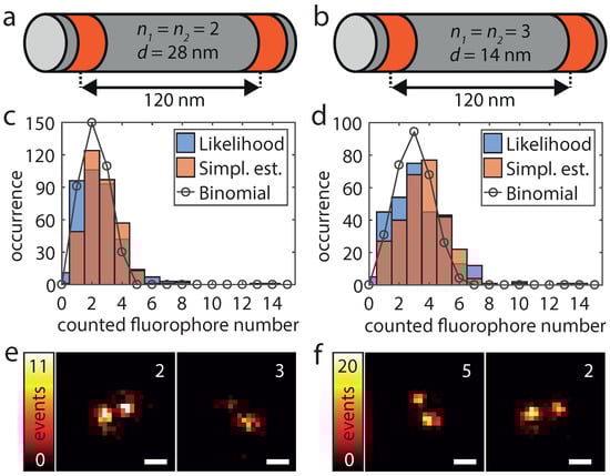 To validate the applicability of the HTMM also under real conditions, we increased the number of dye-conjugated staple strands per DNA origami structure. As depicted in Figure 4a,b, these origami structures have two marked areas which are 120 nm apart and which each features a known number of labeling positions. We name these origami designs /-d, where the first two numbers indicate the number of labeling positions per marked area and the last number indicates the nearest neighbor distance between labeling positions. The first design (2/2-28) exhibits therefore four labeling positions and within each area the two labeling positions exhibit a mutual distance of 28 nm (Figure 4a). The second design (3/3-14) has an additional labeling position in the center of each area which changed the minimum mutual distance of labeling positions to 14 nm and the overall number of labeling positions to six (Figure 4b). Since the traces are recorded directly and disturbing influences such as background signal or detector noise do not cumulate, we expect the counting to work even better than with the added single molecule traces. As the labeling yield p is not 100%, the number of fluorophores per origami structure (k) should be binomially distributed according to . Because unlabeled origami structures cannot be detected and were therefore not analyzed, the counted number of molecules then follows conditioned on . As shown in Figure 4c,d, the determined number of fluorophores of 380 (2/2-28) resp. 297 (3/3-14) analyzed origami structures corresponds very well to a conditional binomial distribution with , resp. , . In addition, the counted number of dye molecules can easily be mapped to the super-resolved image. It should be noted that the number of localizations per individual fluorophore can vary greatly due to the statistic nature of the blinking events (Figure 4e,f).