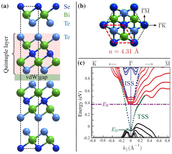 - Miyamoto, K.; Kimura, A.; Okuda, T.; Miyahara, H.; Kuroda, K.; Namatame, H.; Taniguchi, M.; Eremeev, S.V.; Menshchikova, T.V.; Chulkov, E.V.; et al. Topological Surface States with Persistent High Spin Polarization across the Dirac Point in Bi2Te2Se and Bi2Se2Te. Phys. Rev. Lett. 2012, 109, 166802. [Google Scholar] [CrossRef]