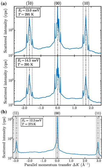 Figure 2 shows the scattered He intensity versus momentum transfer (1) with the scans taken at different incident-beam energies along the (a) and (b) directions. Along , there appear sharp additional peaks (illustrated by the vertical dashed lines) next to both the specular and the first-order diffraction peaks (vertical dash-dotted lines) at an average spacing of about with respect to the diffraction peaks (Figure 2 and Figure 3b at an enlarged scale). The fact that these satellite peaks appear at the same momentum transfer with respect to the specular, as well as to the first-order diffraction peaks, independently of the incident energy, shows that they are neither caused by bound-state resonances [45] nor other artifacts (see the section on CDW satellite peaks in Appendix B, as well as additional scans in Figure A1), but have, necessarily, to be ascribed to a long-period surface superstructure of the electron density, i.e., a surface CDW.