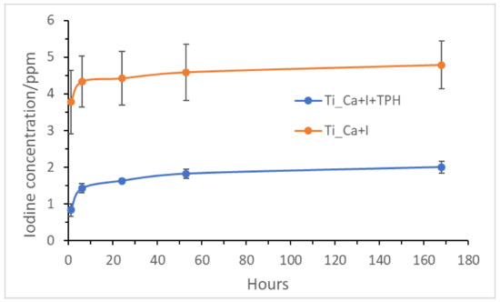 Iodine concentration released from Ti_Ca+I and Ti_Ca+I+TPH as a function of the soaking time in PBS (in hours).
