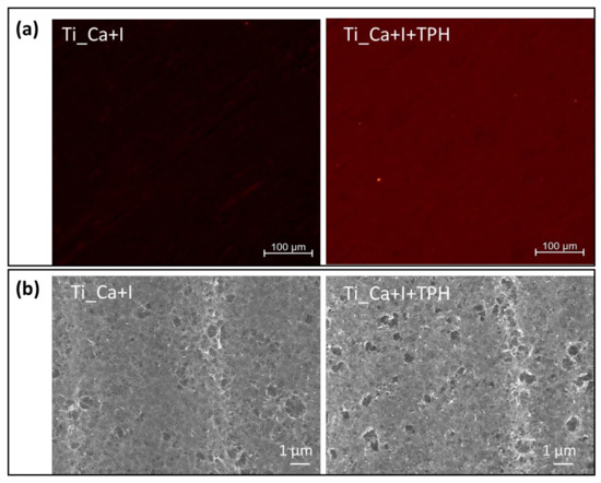 Morphology of Ti_Ca+I and Ti_Ca+I+TPH samples. (a) Fluorescence microscopy observations.(b) Surface FE-SEM images.