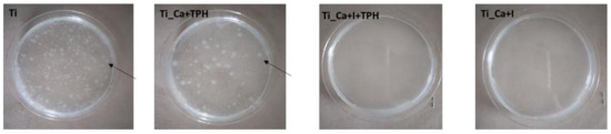 The antibacterial activity of untreated titanium (Ti), Ti_Ca+TPH, Ti_Ca+I, and Ti_Ca+I+TPH against Escherichia coli (E. coli; IFO3972) was estimated according to the ISO22196 standard [38]. Drops of bacterial cell suspensions (100 µL) in RPMI 1640 t broth were injected onto the 25 × 25 × 1 mm3-sized samples and covered with a 20 × 20 mm2 sterile flexible polypropylene film so that the solutions were firmly in contact with the substrate. The samples thus prepared were stored in Petri dishes in an incubator with controlled humidity and temperature (95% and 35 °C, respectively) for 24 h. After 24 h, the samples were removed from the incubator and rinsed with 10 mL of soybean casein digestion bar containing lecithin and polyoxyethylenesorbitan monooleate (SCDLP) to collect bacteria grown during incubation. Finally, the number of bacterial cells was calculated using the dilution factor and the number of colonies counted on the Petri dish.