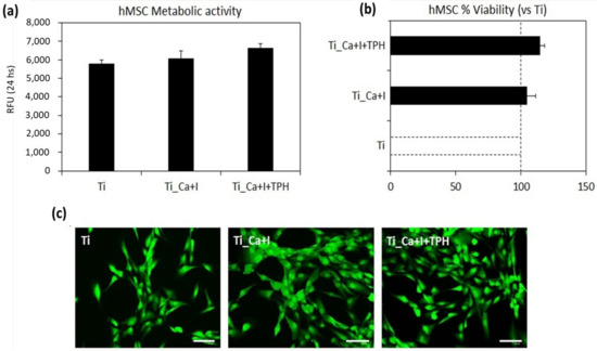 Cytocompatibility evaluation. Surface functionalization with iodine (Ti_Ca+I) and polyphenols (Ti_Ca+I+TPH) did not decrease hMSC metabolic activity in comparison to the Ti controls ((a), p > 0.05) giving a positive boost of ≈5% and ≈15%, respectively. (c), Live/dead images confirmed that cells were viable (stained in green) with a proper morphology and comparable surface density. (b), bars represent means ± dev.st, replicates = 3. Images bar scale = 125 μm.
