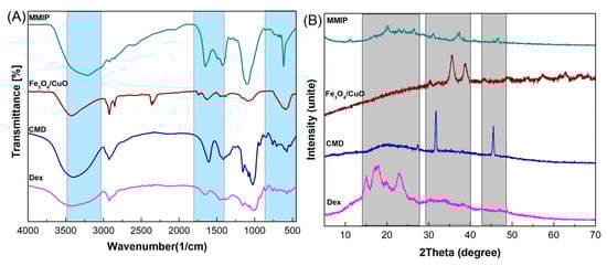 FTIR spectra (A) and XRD patterns (B) of dextrin (Dex), carboxymethyl dextrin (CMD), Fe3O4/CuO, and magnetic molecularly imprinted polymer (MMIP).