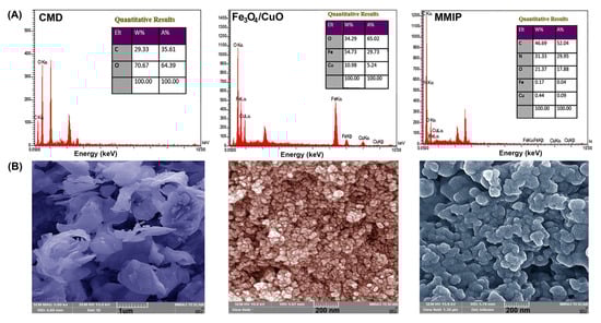 EDX spectra and tabulated data (A) and FESEM images (B) of carboxymethyl dextrin (CMD), Fe3O4/CuO, and magnetic molecularly imprinted polymer (MMIP).