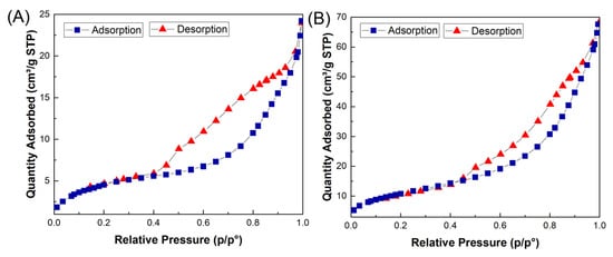 BET: Brunauer–Emmett–Teller (BET) analysis was employed to study the textural properties, porous structure, and specific surface area of the Fe3O4/CuO and MMIP. The specific surface area of the Fe3O4/CuO and MMIP was measured at about 17 m2/g and 46 m2/g, respectively. N2 adsorption–desorption isotherms for both samples are shown in Figure 5, with a type-IV profile and a hysteresis loop between adsorption and desorption, indicating their mesopores structure. Therefore, the high surface area and porous structure of the fabricated adsorbent, MMIP, facilitates the diffusion and adsorption of antibiotic molecules.