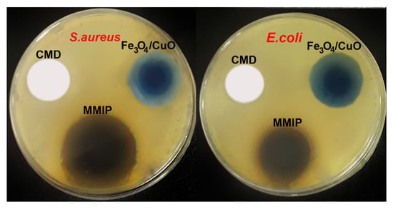 Antibacterial study: One of the key ideas for the survival of people, animals, and plants is the control of the growth of microorganisms in the environment. Antibiotic-resistant bacteria are quickly turning into a difficult medical problem in modern society. Even the most modern medications cannot effectively treat bacterial infections that are resistant to two or more types of antibiotics [38]. In the post-antibiotic time, it is vitally necessary to discover new and alternative methods to fight multi-drug-resistant bacterial diseases. Therefore, the preparation of antimicrobial biomaterials, which seems to be a potential strategy for the decontamination of bacteria-contaminated water is of considerable interest. Additionally, various efforts have been made to create polymeric materials with possible antimicrobial activity. In this respect, the antibacterial activity of CMD, Fe3O4/CuO, and MMIP was assessed against Escherichia coli (E. coli is a Gram-negative bacteria) and Staphylococcus aureus (S. aureus is a Gram-positive bacteria). The results of the inhibition of bacteria were correlated to the commonly used antibiotics gentamicin and chloramphenicol (Table 2 and Figure 6). While the Fe3O4/CuO nanoparticles showed strong antibacterial action against both E. coli and S. aureus bacteria, CMD did not exhibit inhibition against them. The formation of radical oxygen species by the released Fe and Cu ions, which damages the bacterial cell membranes, is thought to be the cause of the Fe3O4/CuO nanoparticles’ antibacterial properties [39]. The observed synergic effect in the antibacterial activity of MMIP could be because of the presence of Fe3O4/CuO and poly(phenylenediamine) and aniline in the polymer structure [40,41,42].