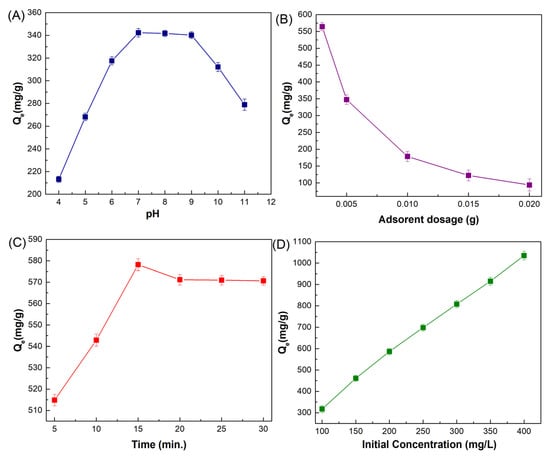 (A) Effect of solution pH (4–11) on adsorption capacity (mg/g) [MMIP dosage (5 mg), ciprofloxacin initial concentration (200 mg/L), V (0.01 L), Time (30 min), T (298 K)], (B) MMIP dosage (3–20 mg) on adsorption capacity (mg/g) [pH 7, ciprofloxacin initial concentration (200 mg/L), V (0.01 L), Time (30 min), T (298 K)], (C) contact time on adsorption capacity (mg/g) (5–30 min) [pH 7, MMIP dosage (0.003 g), ciprofloxacin initial concentration (200 mg/L), V (0.01 L), T (298 K)] and (D) ciprofloxacin initial concentration (100–400 mg/L) on adsorption capacity (mg/g) [pH 7, MMIP dosage (3 mg), V (0.01 L), Time (15 min), T (298 K)].