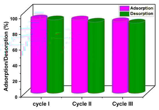 In order to save money, time, and energy while protecting the environment, adsorbent recoverability and reusability are essential. Adsorbents having these characteristics therefore greatly minimize the difficulties involved in the disposal of old adsorbents and the production of new adsorbents [18,58]. The recoverability and regeneration of the MMIP sorbent were examined using three sequential cycles of adsorption and desorption tests. For this purpose, the ciprofloxacin adsorption test onto the MMIP was performed (reaction condition: pH = 7, MMIP dosage = 3 mg, contact time = 15 min, antibiotic initial concentration: 200 ppm, T = 298 K). Afterward, to desorb ciprofloxacin, the ciprofloxacin-loaded used MMIP was immersed in ethanol and agitated for 4 h at room temperature. Ciprofloxacin was therefore desorbed from fabricated MMIP and released into the solution, the adsorbent was separated using a magnet, washed many times with distilled water, and then dried to prepare for future adsorption/desorption investigations. Subsequently, using a UV-visible spectrophotometer, the amount of released ciprofloxacin in the elution medium was measured. As seen in Figure 10, after the third cycle, the adsorption percentage fell from 95.18 to 91.61%, and the desorption percentage from 94.01% to 89.86%. These results show that ciprofloxacin could be removed by the MMIP three times in a row without significantly weakening its ability to adsorb the antibiotic.