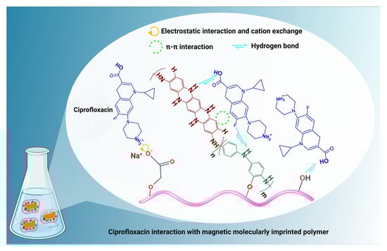 Moreover, the size and geometry of the holes created by structural monomers or crosslinkers, as well as the chemical interactions between the template and the functional monomer, determine the specificity of the MIPs. Because of this, selecting the functional monomer that will be utilized for MIP synthesis is essential for achieving successful outcomes. Non-covalent interactions between the functional monomer and template, such as hydrophobic or ionic contact, dipole–dipole and π–π interactions, and hydrogen bonding, are commonly used to generate MIPs. As a result, it is chosen based on the functional groups present in the chemical structure of the molecule utilized as a template. Chemical groups in Ciprofloxacin, such as secondary and tertiary amines, and a carboxylic acid, can interact chemically with MIP cavities. Consequently, herein, MMIP was developed in three steps: self-assembly, copolymerization, and template removal. Afterward, MMIP can interact with ciprofloxacin and remove it from water through electrostatic interaction, cation exchange, π–π interactions, and hydrogen bonding.