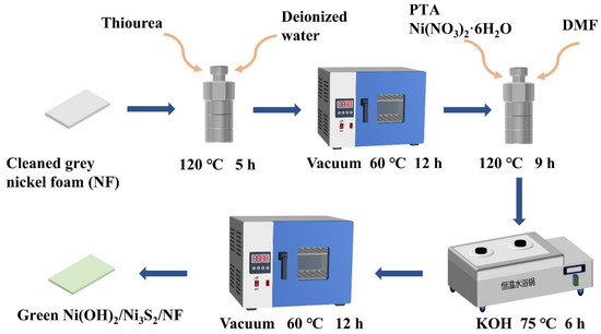 Prior to the experiments, the NF (1.5 × 2 cm) was successively cleaned with acetone, 1 M HCl aqueous solution, deionized water (DI), and absolute ethanol in an ultrasonic cleaner to remove the organic matter and oxide layer and then dried in a vacuum drying oven at 60 °C for 12 h. The cleaned grey NF was placed in a 50 mL Teflon-lined stainless autoclave containing a homogeneous solution of 35 mL of DI and 10 mmol thiourea. The Teflon stainless autoclave was kept at 120 °C for 5 h to synthesize Ni3S2, which was subsequently cooled to room temperature. The samples were taken out and gently cleaned in DI and absolute ethanol. In brief, 2 mmol Ni(NO3)2·6H2O and 0.5 mmol PTA were dissolved in 30 mL of DMF and stirred for 60 min. The NF with in-situ synthesized Ni3S2 and the above solution were transferred into a 50 mL Teflon stainless autoclave to heat at 120 °C for 9 h, after which Ni-MOF was deposited onto Ni3S2. The resultant sample was gently cleaned several times by DMF and DI and then immersed in KOH solution at 75 °C for 6 h to transform Ni-MOF into MOF-derived Ni(OH)2. The sample was washed in DI before vacuum drying 60 °C for 12 h to obtain NF coated with green materials. The above synthesis process is clearly and intuitively illustrated in Figure 1.