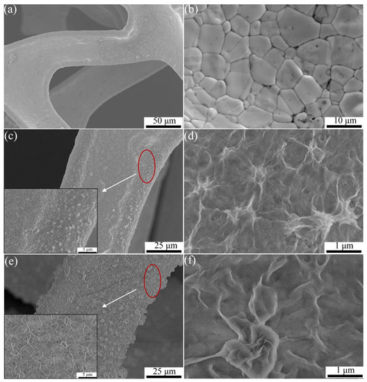 The morphology of pure NF, Ni3S2/NF, and Ni(OH)2/Ni3S2/NF were characterized using a field-emission scanning electron microscope. A large number of equiaxed grains with a size of approximate were observed on the skeleton of NF (Figure 4a,b). The low-magnification images of the Ni3S2/NF electrode showed that the NF skeleton was uniformly covered with a layer of dense substances (Figure 4c,d). Therefore, Ni3S2 with a honeycombed structure was in-situ synthesized on the NF surface. Ni3S2 with a similar structure was also reported by Wei et al. [39]. When the electrode was subjected to the second hydrothermal process and subsequent alkaline treatment, its surface became rough due to the abundant nanosheets protruding from the Ni3S2/NF surface (Figure 4e). Some even clustered together to form a flower-like structure, which connected to the individual nanosheets to create a typical honeycombed structure (Figure 4f). This finding indicated that the Ni(OH)2 derived from Ni-MOF recombined on the Ni3S2/NF surface. The honeycomb structure of Ni(OH)2/Ni3S2 was formed through two processes. First, Ni-MOF recombined on the surface of Ni3S2/NF by ”selective attachment“ and ”self-assembly“ [40]. Ni2+ and carboxyl organic ligands selectively attached to the high energy sites (protrusion) of Ni3S2 nanosheets and then self-assembled to form Ni-MOF on Ni3S2. Second, the organic ligands of Ni-MOF were replaced by OH− and then converted into Ni(OH)2. The evolution mechanism of Ni-MOF converted to Ni(OH)2 is related to a “crystal–crystal conversion” mechanism [29]. When Ni-MOF was immersed in an alkaline solution, Ni(OH)2 with a hexagonal structure was formed due to the carboxyl organic ligands being replaced by OH−. The Ni(OH)2 molecules lined up along the crystal plane parallel to the Z-axis and grew along the X–Y crystal plane, eventually forming the sheets. A large number of ultrathin nanosheets joined to one another to form a honeycomb structure. Owing to the high porosity of Ni-MOF retained in the Ni(OH)2 derived from Ni-MOF and the large specific surface area involved in the honeycombed structure, the diffusion path of OH- in the electrolyte was greatly shortened and additional active sites were provided. Hence, the electrochemical performance of the electrode material was improved.