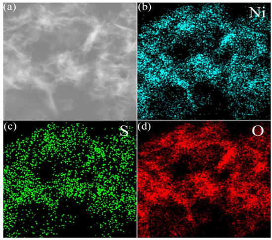 In Figure 6, the EDS element mapping analysis of Ni(OH)2/Ni3S2/NF revealed the co-existence of Ni, S, and O elements. This finding was consistent with the XPS results. The elements were uniformly distributed on the nanosheets. The content of O and Ni elements was higher than that of the S element, possibly because Ni3S2 was coated by Ni(OH)2. This result further proved the successful preparation of Ni3S2/Ni(OH)2/NF.