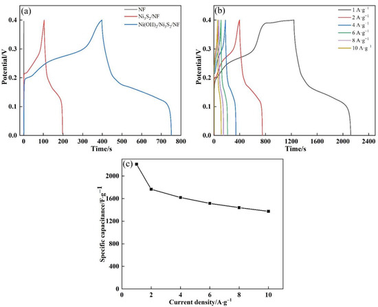 (a) GCD curves of NF, Ni3S2/NF and Ni(OH)2/Ni3S2/NF at the current density of 2 A·g−1; (b) GCD curves of Ni(OH)2/Ni3S2/NF at the current density from 1 to 10 A·g−1; (c) Specific capacitance of Ni(OH)2/Ni3S2/NF at different current densities.