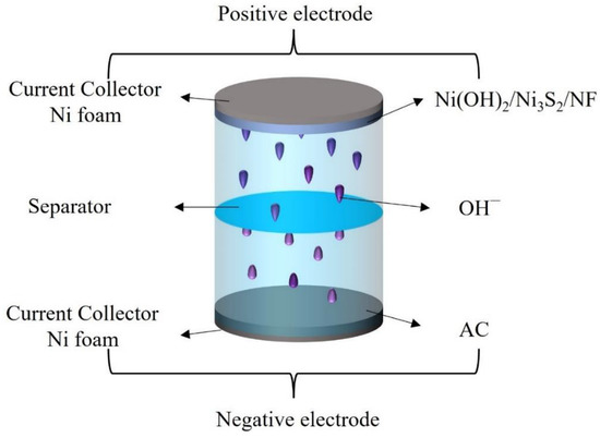 Schematic diagram of the Ni(OH)2/Ni3S2/NF//AC hybrid supercapacitor (HSC).
