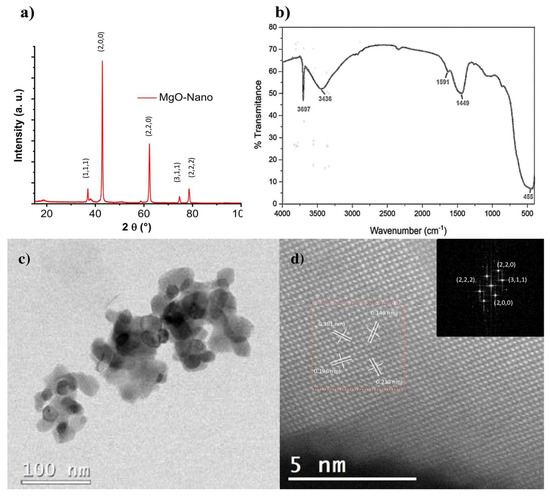 Characterization of MgO-NPs. (a) In X-ray diffraction, the peaks observed were indexed according to the JCPDS with the card number: 89-7746, and the corresponding crystal planes of MgO were indexed to (111), (200), (220), (311) and (222). (b) In FT-IR spectra, the signals at 3697 cm−1 and 3436 cm−1 are characteristic of the O–H stretching band. The peaks at 1449–1591 cm−1 correspond to the bending vibration of the O–H; these strong bands appear due to the hygroscopic nature of MgO, whereas the strong peak around 455 cm−1 is due to the stretching vibrations of the bond between Mg and O. (c) Transmission electron microscopy (high resolution) of MgO-NPs indicate the shapes to be polyhedric, with sizes smaller than or close to 100 nm. Likewise, the results of the analysis conducted in high resolution (d), showed that the interplanar distances coincide with the reflections of the crystal structure of the MgO.