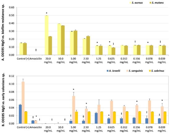 Microbial susceptibility of MgO-NPs against (A) resistant biofilm strains Staphylococcus aureus and Streptococcus mutans. (B) Early colonizers were Actinomyces israelii, Streptococcus sanguinis, and Streptococcus sobrinus. OD595: optical density λ at 595 nm averaged triplicated values; Control (+): bacteria positive control, Amoxicillin: inhibition control, and MgO dissolution used (20 mg/mL to 0.039 mg/mL). Paired differences were determined by Student’s t-test after adjusting per triplicate results as previously described by [27]. The difference between each strain Control + versus each plate dilution is shown as * p < 0.05; ƚ p < 0.01; ǂ p < 0.001.