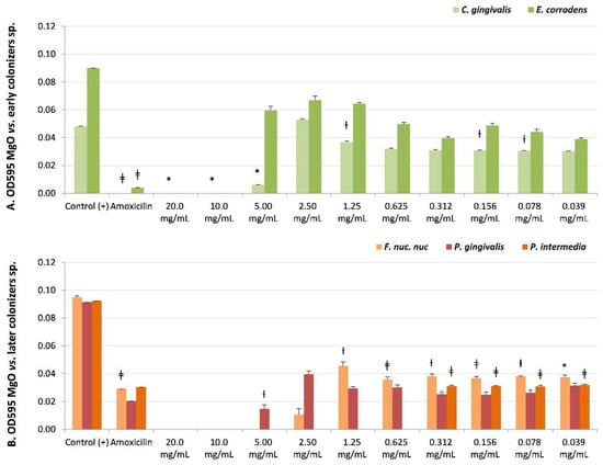 Microbial susceptibility of MgO-NPs against (A) early colonizer strains Capnocytophaga gingivalis and Eikenella corrodens and (B) later colonizers F. nuc. nuc: Fusobacterium nucleatum subsp. nucleatum, Porphyromonas gingivalis, and Prevotella intermedia. OD595: optical density λ at 595 nm averaged triplicated values; Control (+): bacteria positive control; Amoxicillin: inhibition control, and MgO dissolution used (20 mg/mL to 0.039 mg/mL). Paired differences were determined by Student’s t-test after adjusting per triplicate results as previously described by [27]. The difference between each strain Control + versus each plate dilution is shown as * p < 0.05; ƚ p < 0.01; ǂ p < 0.001.