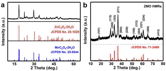 XRD patterns of the (a) ZnC2O4-MnC2O4·2H2O precursor and (b) ZMO HMRs.