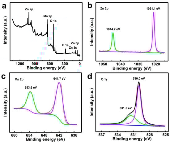To further confirm the detailed element composition and valence state of the ZMO HMRs, X-ray photoemission spectroscopy (XPS) studies were carried out as shown in Figure 3. The presence of Zn, Mn, and O in the ZMO HMRs can be observed in the survey XPS spectrum (Figure 3a) and the valence states of the elements are shown in high-resolution XPS spectra in Figure 3b–d. Figure 3b presents the spectrum and corresponding fitting curve of Zn 2P, where the binding energies of 1021.1eV and 1044.2 eV are indexed to Zn 2p3/2 and Zn 2p1/2, respectively [27]. The difference in spin energy levels between the two peaks (23.1eV) indicates the oxidation state of Zn (II) in the ZMO sample, and the two peaks presented at 641.7 and 653.6 eV in Figure 3c can be ascribed to the Mn 2p3/2 and Mn 2p1/2 of Mn3+ [15,16,23,27]. The spectrum of O 1s (Figure 3d) shows the binding energy positions at 530.0 and 531.5 eV, corresponding to the oxygen in the metal–oxygen bond [28,29] and oxygen in –OH, respectively [30].