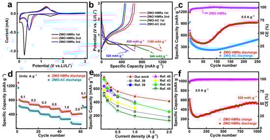 Electrochemical evaluation of the ZMO HMRs and ZMO-AC: (a) CVs curves of ZMO HMRs (0.1 mV s−1), (b) galvanostatic charge–discharge profiles at 0.5 A g−1, (c) cycling stabilities 0.5 A g−1, (d) rate capacities, (e) comparisons in rate performance between ZMO HMRs and other reported Mn-based metal oxide anodes, and (f) cycling performance at 2.0 A g−1.