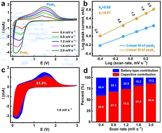 (a) CV curves with different scan rates, (b) logi vs. logv profiles, (c) the capacitive contribution (red region) and battery-type contribution (blue region) at 1.6 mV s−1, and (d) normalized capacitive (red region) contribution ratios at different scan rates.