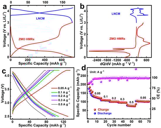 (a) The charge–discharge plots of LNCM and ZMO HMRs at 0.1 A g−1. (b) Corresponding dQ/dV curves of the LNCM and ZMO HMRs. (c) Charge and discharge profiles, and (d) rate capability of LNCM/ZMO HMRs full battery.