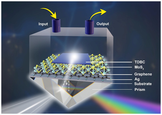 The sensing area of the SPR sensor in this study is a five-layer system that is based on vdWHs and consists of glass, silver film, graphene, molybdenum disulfide (MoS2), and polyvinyl alcohol (PVA) mixed with TDBC film. A diagrammatic sketch is shown in Figure 1. The sample chamber was designed to achieve circulation of the air or liquid environment. The input and output can be respectively connected with a microfluidic pump to achieve the flow of the target detector and improve the accuracy of detection. The organic molecule TDBC is a J-aggregation molecule. When the TDBC molecules in the PVA solution reach a certain concentration, they undergo J-aggregation. The wavelength range of the detection light is 475 nm–960 nm [25]. PVA is a porous medium, so small molecules can pass through the pores and adhere to the surface of the detection layer through electrostatic adsorption. The change in the number of molecules near the surface of the sensing layer causes a small change in the refractive index near the interface. The small refractive index change in the sensing interface can lead to a change in the SPR signal. Therefore, the change in the refractive index of the sensing medium surface can be determined by monitoring the change in the SPR signal to quantitatively analyze the target detection object.