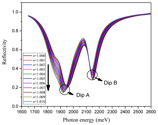 The strong coupling effect between the SPR polaron and exciton is very sensitive to changes in the refractive index of the external environment. In fact, it can be seen in Figure 5 that the environmental refractive index has a different influence on the two dips of the SPR spectrum. There were significantly greater changes in the low-energy branch than in the high-energy branch.
