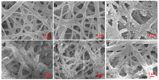 SEM images of (a) the SBS fibrous membrane, (b) the SBS/PDA fibrous membrane and (c)–(f) the SBS/PDA/SiO2 fibrous membrane with SiO2 NPs concentrations of (c) 0.5 wt%, (d) 1.0 wt%, (e) 2.0 wt% and (f) 4.0 wt%, respectively.
