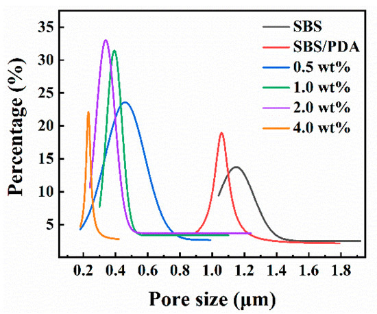 The effect of concentration of SiO2 NPs on the morphology of the SBS/PDA/SiO2 fibrous membranes was evaluated. As shown in Figure 2a, the SBS fibers which have smooth surfaces were interwoven to form nonwoven webs. The SBS fibrous membrane has interconnected pore structures. The pore size of the membrane distributes within the range from 1.04 µm to 1.92 µm (Figure 3). The maximum pore size (dmax) of 1.92 µm is the maximum value of pore size data. The mean pore size (r) is the average pore size. The r of the membrane is 1.44 µm (Table 1). After the in-situ polymerization of DA, the membrane morphology has little change. The pore size of the membrane distributes within the range from 0.90 µm to 1.86 µm (Figure 3). The r of the membrane slightly reduced to 1.34 µm (Table 1). As SiO2 NPs stick to surface of the SBS fibers by adhesive PDA, the SBS/PDA/SiO2 fiber forms a nano-scale convex character but retains pore structures (Figure 2c–f). The pore size of the SBS/PDA/SiO2 fibrous membrane with 0.5% SiO2 NPs decreases significantly compared with that of the SBS fibrous membrane (Figure 3). The r of the SBS/PDA/SiO2 fibrous membrane with 0.5% SiO2 NPs is 0.42 µm with a decline of 64% (Table 1). As the SiO2 NPs concentration increases from 0.5 wt% to 4 wt%, dmax of the SBS/PDA/SiO2 fibrous membrane decreased from 1.02 μm to 0.45 μm, and r decreased from 0.42 µm to 0.30 µm, indicating that the pore size distribution of the SBS/PDA/SiO2 fibrous membranes becomes narrow and pore size declines, which is due to the significant SiO2 NPs coating on the surfaces of the SBS fibers.