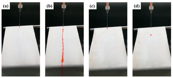 The super-hydrophobic property of the SBS/PDA/SiO2 fibrous membrane is demonstrated in Figure 6 and Movies S1 and S2. The fibrous membranes are placed on the shelf with an inclination angle of 25°. The red dye droplets are continually dripped on the surface of fibrous membranes. As shown in Figure 6a, b and Movie S1, the red dye droplets have an obvious wetting effect on the SBS fibrous membrane, which stick on the membrane surface, until a large droplet gathers, then falls with gravity, and leaves a line of red stain. Compared with the SBS fibrous membrane, the red dye droplets roll off immediately when they are dripped on the surface of the SBS/PDA/SiO2 membrane and leave no stain, as shown in Figure 6c, d and Movie S2.