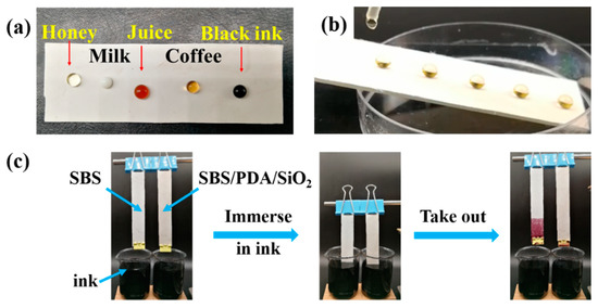 In addition to an aqueous solution of red dye, five common stains were chosen to further investigate the anti-fouling ability of the SBS/PDA/SiO2 fibrous membrane. As shown in Figure 9a, the droplets of honey, milk, juice, coffee and ink are dipped on the SBS/PDA/SiO2 fibrous membrane surface. Five droplets can maintain spherical shapes. Furthermore, as shown in Figure 9b and Movie S5, honey is dripped on the inclined SBS/PDA/SiO2 fibrous membrane, which rolls off the membrane and leaves no stain. Movie S5 also demonstrates the droplet tests of the other four types of liquids, which also roll off immediately with no traces left on the membrane surface. An additional experiment takes place in a cup of ink, as sown in Figure 9c. The SBS fibrous membrane and the SBS/PDA/SiO2 fibrous membrane are immersed in ink simultaneously. A few minutes later, the membranes are taken out from the ink. The results show that the SBS fibrous membrane is painted a deep purple–aubergine in the immersed part. In contrast, the SBS/PDA/SiO2 fibrous membrane has left no stain. These tests prove that the SBS/PDA/SiO2 fibrous membrane has excellent super-hydrophobic and anti-fouling properties.
