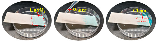 As shown in Figure 10, a layer of CuSO4 particles is spread on the SBS/PDA/SiO2 membrane surface which is placed on an inclined plane. Then, the membrane surface is rinsed with a small amount of water. The CuSO4 particles in the place washed with water are carried away easily, leaving a clean surface. Due to the “lotus effect”, the dirt particles are picked up by water droplets due to the micro-convex architecture on the membrane surface, which minimizes the droplet’s adhesion to that surface. Thus, the SBS/PDA/SiO2 fibrous membrane exhibits excellent self-cleaning performance.