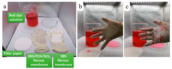 The high-performance fibrous membrane is suitable for people exposed to wastewater and pollution in the field of medicine and healthcare, paper and textile manufacturing, petroleum and the mining industry, as well as sewage services. In Figure 13a, the SBS and SBS/PDA/SiO2 fibrous membranes are attached on both sides of the fingers and palms of the latex gloves. In Movies S7 and S8, the experimenter wears the SBS and SBS/PDA/SiO2 fibrous membrane-modified gloves, respectively, and takes a piece of filter paper and immerses the filter paper and hand in a red dye solution. As a result, the filter paper is colored red rapidly. The uncovered surface of the glove turns slightly pink and leaves a dye stain. The surface of the SBS fibrous membrane drips with liquid beads of red dye (Figure 13b). Only the SBS/PDA/SiO2 fibrous membrane is undyed, and its surface has no drops of red dye remaining (Figure 13c). It can be expected that the fibrous membrane with excellent waterproof and breathable properties and self-cleaning performance ensures protective equipment, such as gloves, masks and suits, sit securely and remain comfortable even during prolonged periods of use, avoid troubles of wear and can be taken off frequently.