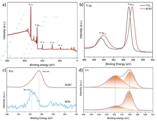 The XPS spectra of BT, BCB, and BCBT: (a) survey spectrum of BCT; (b) Ti 2p and (d) O 1 s of BT and BCBT; and (c) B 1 s spectra of BCN and BCBT.