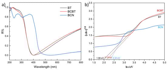 (a) UV-vis diffuse reflectance spectra of the as-prepared BT, BCN, and BCBT. (b) Relationship of (ahν) 1/2 vs. E (ev).