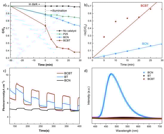 Photocatalytic degradation efficiencies on the degradation of TC under simulated solar light irradiation (a), and kinetic linear simulation curves (b), photocurrent curves (c), and PL spectra (d) of BT, BCN, and BCBT, respectively.
