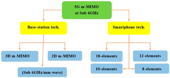 Many techniques support massive MIMO systems in smartphone applications working in the sub-6 GHz bands, which are classified depending on the number of elements.
