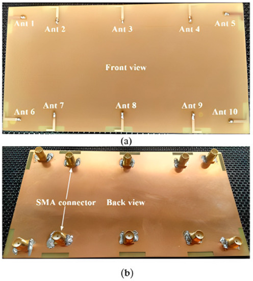 Fabricated prototype of the (10 × 10) MIMO of T-shaped, coupled fed-slot antenna elements. (a) Front view, (b) back view [61].