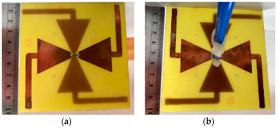 The fabricated prototypes: (a) (4 × 4) mMIMO of dual-band, dual-polarized shared aperture rectangular antenna array, top view; with side view, (b) (4 × 4) transformable dual polarized ME-dipole antenna for 5G array/mMIMO of dual-polarized differential feeding lines [30].