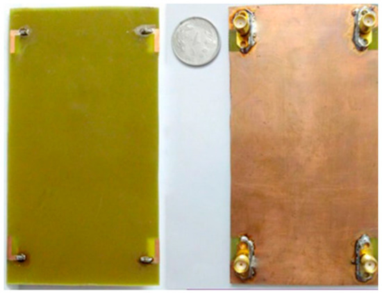 Prototype of the (10 × 10) MIMO antennas with the IFS fed by end launch 50 Ω connectors at the top layer and slots at the bottom layer [60].