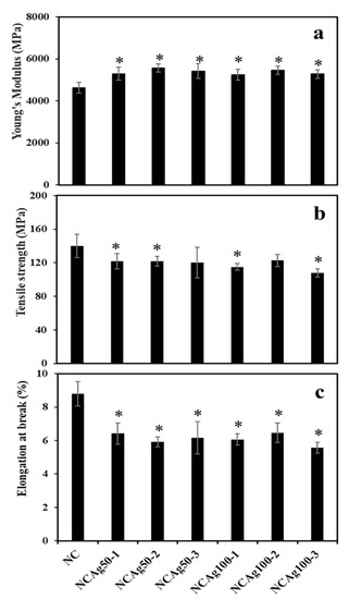 - Rozilah, A.; Aiza Jaafar, C.N.; Sapuan, S.M.; Zainol, I.; Ilyas, R.A. The effects of silver nanoparticles compositions on the mechanical, physiochemical, antibacterial, and morphology properties of sugar palm starch biocomposites for antibacterial coating. Polymers 2020, 12, 2605. [Google Scholar] [CrossRef]