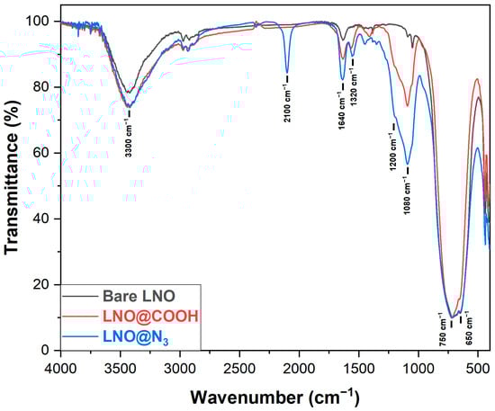 For FTIR characterization, an aliquot of the LNO@COOH NPs or LNO@N3 NPs suspension in EtOH (0.4 mL, 1 mg/mL) was added to KBr (200 mg) and dried at 80 °C for 12 h before compression (2 min, 10 bars) to form a pellet. Samples were analyzed with a Nicolet 6700 FT-IR spectrophotometer (Thermo Fisher Scientific, Waltham, MA, USA).