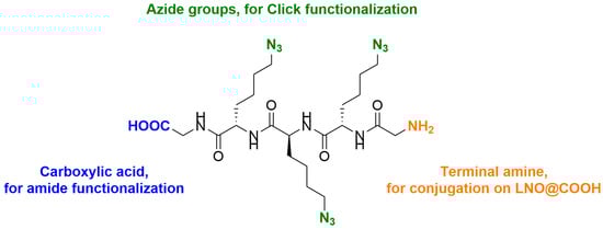 As discussed in Section 3.1, LNO@N3 NPs displayed monodisperse suspension in an alcoholic solution and a high density of surface azido groups. However, their tendency to agglomerate in an aqueous solution and the uneven silanization of LNO@N3 NPs led us to explore an alternative strategy for the introduction of azido groups, while ensuring monodisperse suspension in aqueous medium (PDI < 0.2). Conjugation of LNO@COOH NPs with a branched peptide containing multiple azide-bearing side chains was envisaged to provide the simultaneous presence of azido and carboxylate surface orthogonal functionalities and to improve the hydrophilic character of the functionalized NPs for enhanced colloidal stability in an aqueous medium. The peptide structure design was based on repeating azide-modified lysine units (azidolysine = Alys, synthesis described in the Supplementary Materials, S6). As the number of Alys units could be easily modified, the length of the peptide backbone could be tuned to exhibit various azide-to-carboxylate ratios. The peptide described herein (tri-azidolysine = Talys, Figure 3) contains three Alys units, and was capped with one glycine unit at each end to reduce the steric hindrance on the amine and carboxylic acid groups, thus increasing their reactivity.