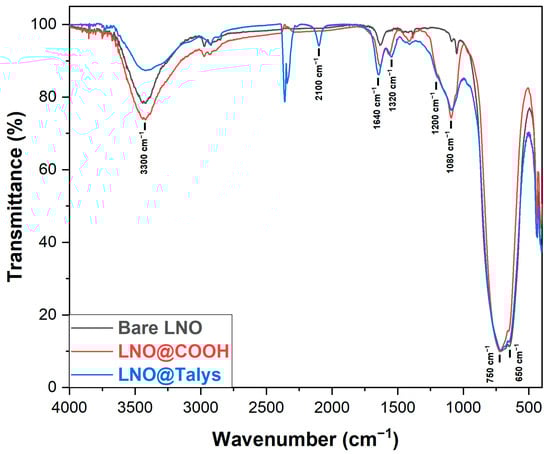 FTIR spectra of bare LNO NPs (black), LNO@COOH NPs (red), and LNO@Talys NPs (blue), normalized with respect to the Nb signal.