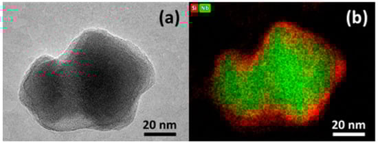 Representative STEM images of LNO@Talys NPs: (a) bright field image and (b) EDX elemental mapping (Si and Nb) of LNO@Talys.
